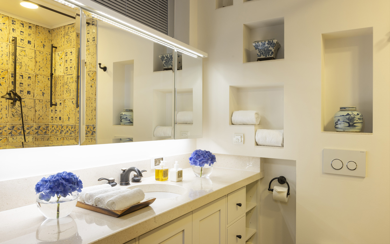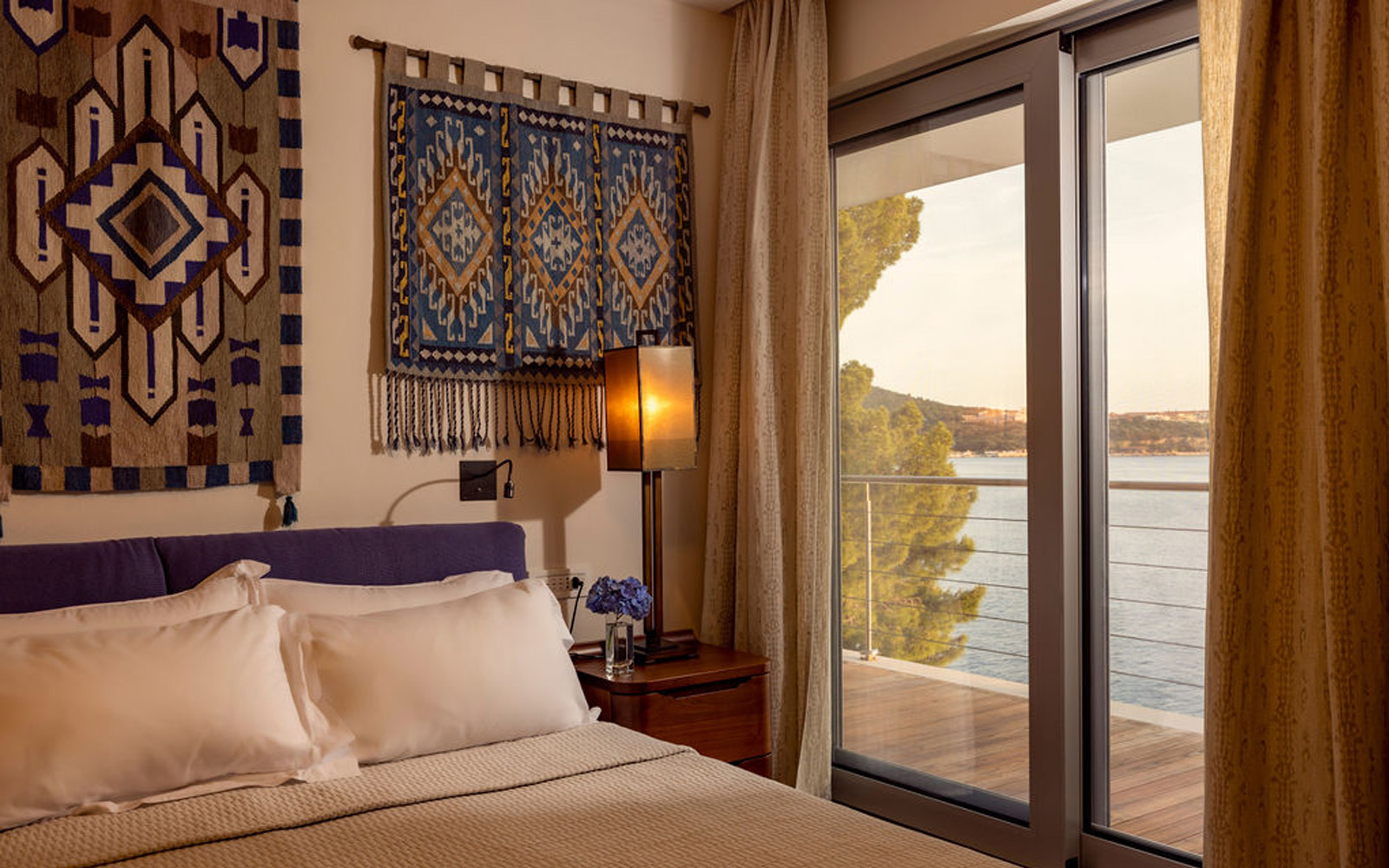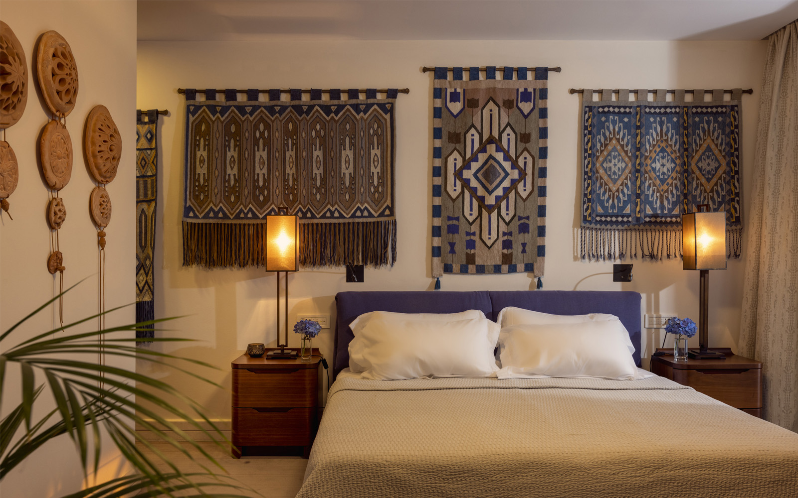 Blue room is located on the west part of the first floor. With special attention, this room was decorated. Handmade tapestries and terracotta wall lamps will make you feel like you are in Florence. The room consists of a double bed, wardrobe, TV, surround system, Bathroom with bathtub, and balcony with sea and garden view. -24 m2