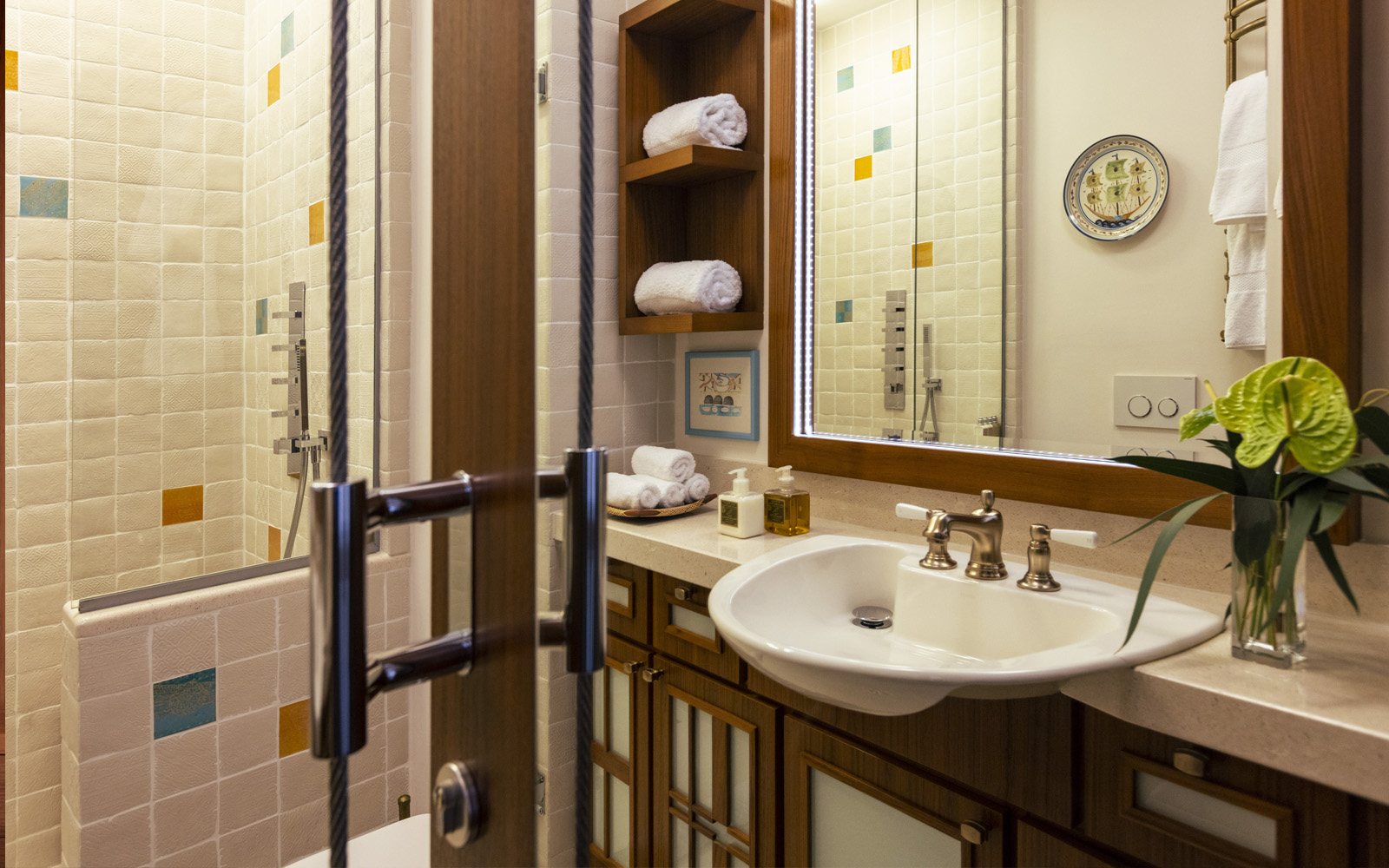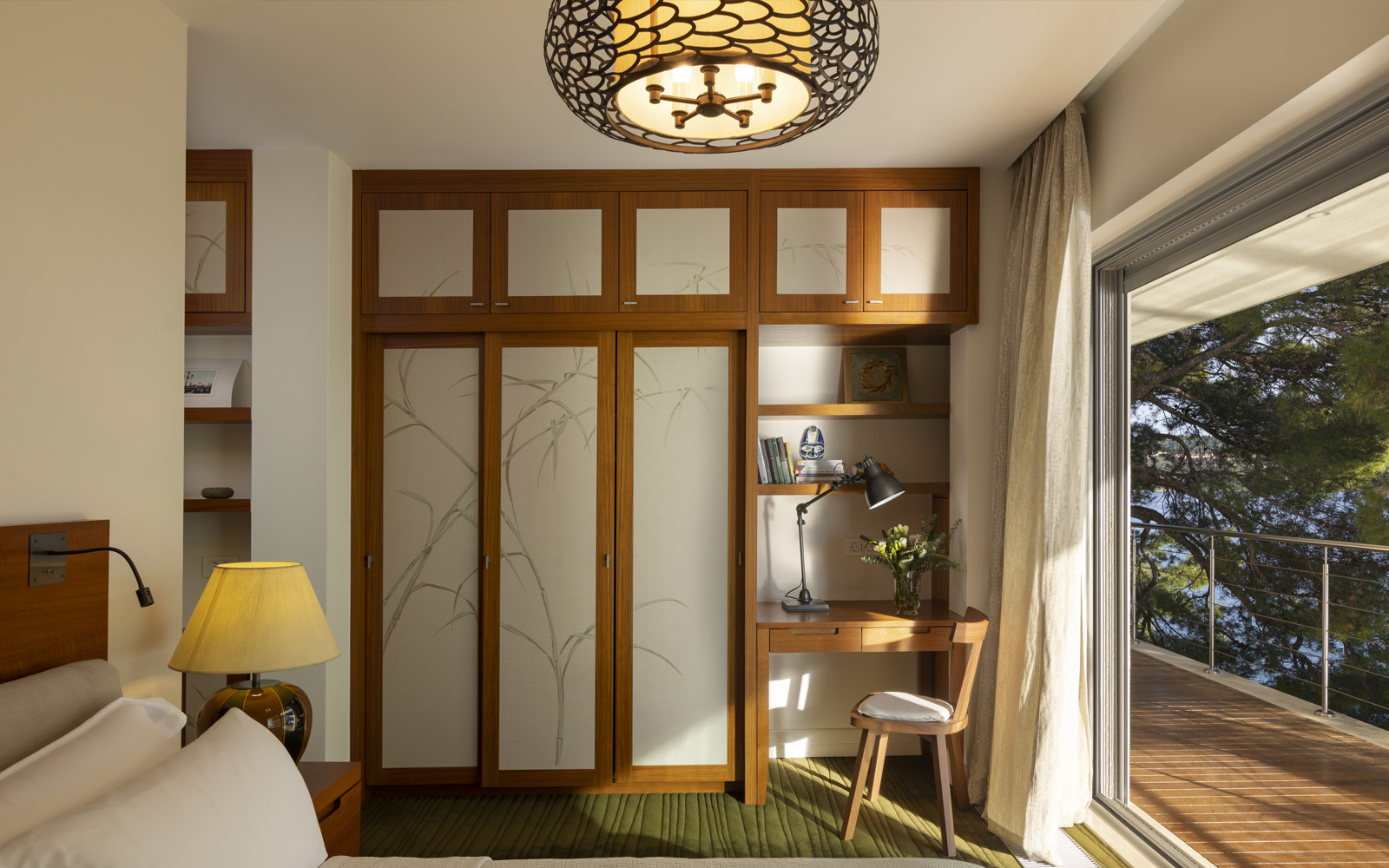 Olive room is located in the east part of the first floor, just next to the Terracotta room. This room consists of a bedroom with a double bed, wardrobe, TV, surround system, Bathroom with shower and balcony with sea view. 21 m2